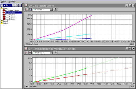 Auch die aktuellen Leistungs- und Verbrauchswerte jedes Eingangs können grafisch dargestellt werden. Dabei ist auch die Darstellung mehrerer Kurven in einer Grafik kein Problem.