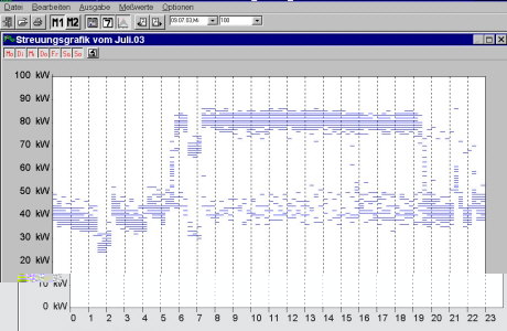 Besonders anschaulich ist die Streugrafik. Alle Periodenwerte eines Monats werden überlagert dargestellt. Hierbei ist auch die Auswertung einzelner Wochentage möglich.